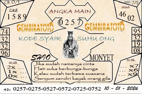 Selamat Datang di SYDNEY Gembiratoto, disini syair paling lengkap dan juga syair yang paling cepat di naikan , dan juga ada prediksi togel yang lain untuk semua pasaran togel tiap hari nya kita upload serta ada paito warna juga, dan semua nya hanya berdasarkan prediksi serta syair tidak ada yang pasti dalam bermain togel semoga angka angka prediksi yang kita keluar kan bisa keluar untuk resultnya Syair.