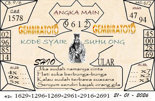 Selamat Datang di SINGAPORE Gembiratoto, disini syair paling lengkap dan juga syair yang paling cepat di naikan , dan juga ada prediksi togel yang lain untuk semua pasaran togel tiap hari nya kita upload serta ada paito warna juga, dan semua nya hanya berdasarkan prediksi serta syair tidak ada yang pasti dalam bermain togel semoga angka angka prediksi yang kita keluar kan bisa keluar untuk resultnya Syair.